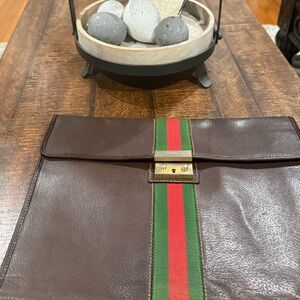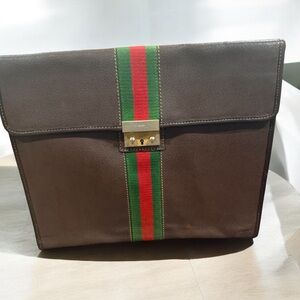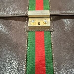 Elevate your style with this Gucci brown leather men's bag. Featuring a classic design with a distinctive green and red stripe, this bag is perfect for any occasion.
