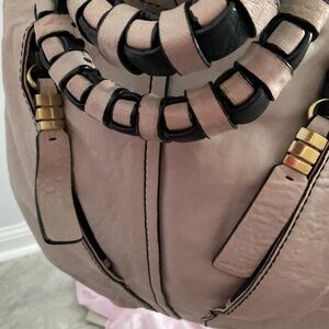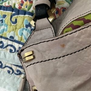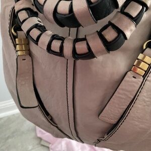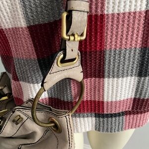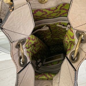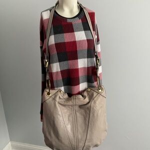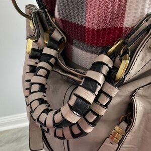 GORGEOUS! Sooo unique Yany bag. Goldtone embellishments.Long removable strap,with 2 braided design handles.Fabric lining,no holes or stains.4 pockets inside. 2 zipper pockets outside.Soft distressed leather. 14/14 in. Fast ship!