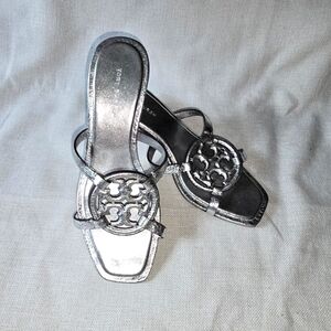 Tory Burch Miller Bombe Silver Women's Sandals Kitten Heel Size 6.5M NWOT