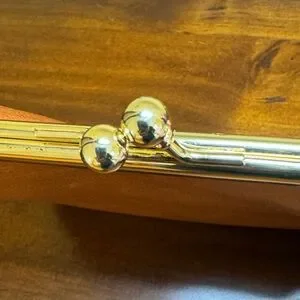 Chic deep orange leather wallet with a classic kisslock closure. Features iconic Dooney & Bourke logo. Compact and stylish.