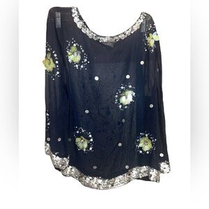 This elegant blue sequined blouse is adorned with beautiful floral designs, perfect for enhancing your wardrobe. Pair it with your favorite bottoms for a sophisticated look. Sheer