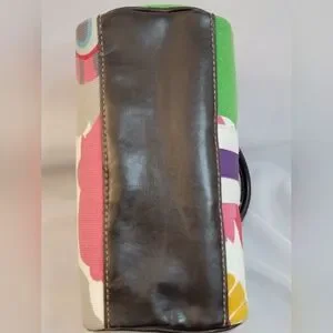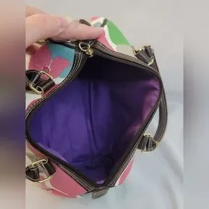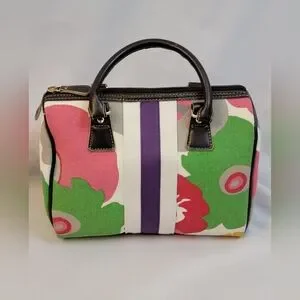 Victoria Secret canvas handbag, 2 short strap handles, zip top closure, one open compartment, stylish floral handbag with vibrant pink, green & purple colors, purple lining, perfect for adding a pop of color to any outfit, travel, vacation, spring, summer, everyday use