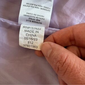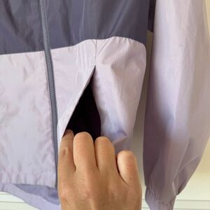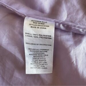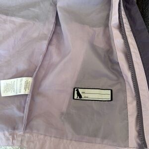 This Eddie Bauer wind jacket is perfect for active girls in fall or spring. The jacket features a softshell fabric with a solid two-tone pattern in purple, long sleeves, and a short jacket/coat length. The full double zip closure and zipper logo. The jacket is made of 100% polyester, both for the outer shell and lining, and is a size medium (36 in chest).