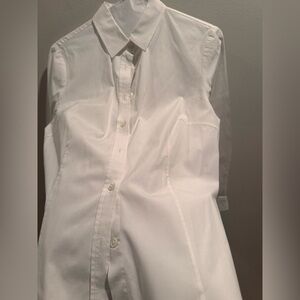 Elegant and versatile white button-up shirt for women. Perfect for both professional and casual settings. Great condition, classy, great material, this item has been dry cleaned! It’s 18” ptp, 15.5” waist, sleeve is 4.5” across buttoned