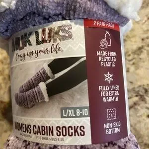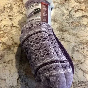 Stay warm with Muk Luks cabin socks. Soft and fully lined. Non-skid bottom for safety. Made from recycled materials.