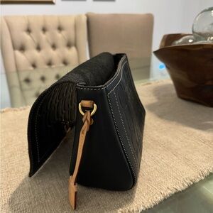 Chic black crossbody with cream strap. Embossed logo design. Gold hardware accents.