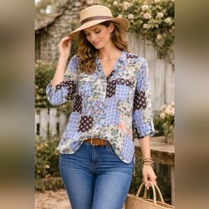 Eden & Olivia blouse, L boho top, patchwork blouse, multicolor button down, boho chic shirt, cottagecore top, floral patchwork blouse, roll sleeve blouse, relaxed fit shirt, casual work blouse