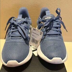 Adidas running shoes in blue with white soles. Lightweight and breathable design.