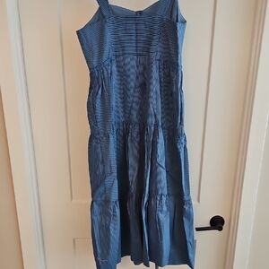 Elegant blue midi dress featuring a striped pattern and button-front. Perfect for casual wear.