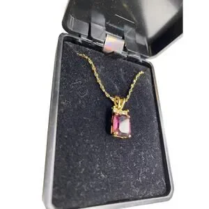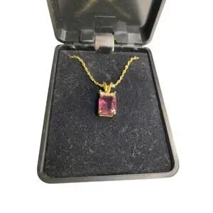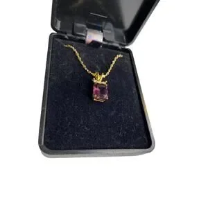 Goldtone Pendant Necklace Emerald Cut Purple Glass 17.5" Chain