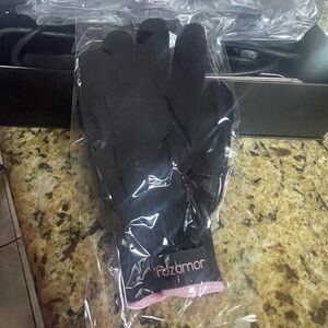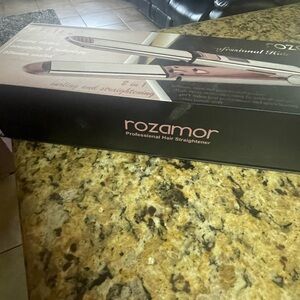 Rozamor hair straightener featuring high-grade titanium plates. Includes LCD temperature display and locking function. Comes in a sleek black and silver design.