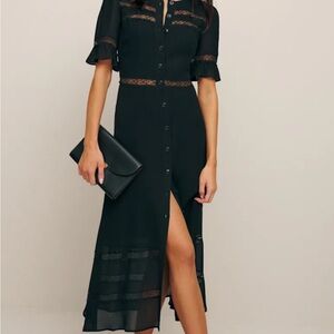 Chic black dress with button-down front. Features lace accents and ruffled sleeves.