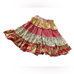 Matilda Jane Serendipity Gentry Skirt! Beautiful mixed fabric print tiers! Elastic waist. This skirt is a size 4, but due to the length can be worn before, and upwards of age 6. This skirt is adorable at all lengths.