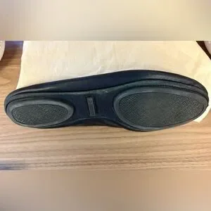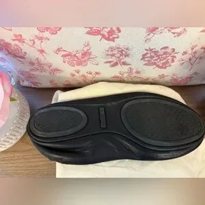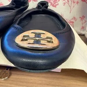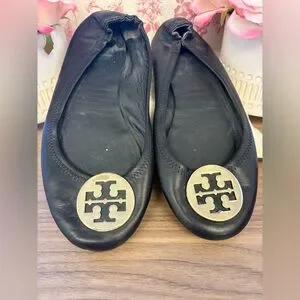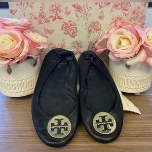 Chic black leather flats featuring a gold Tory Burch logo. Versatile and stylish.