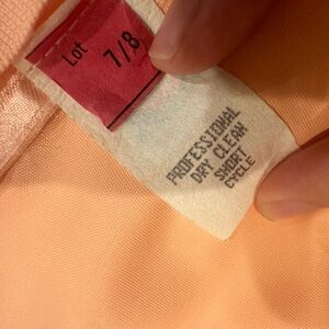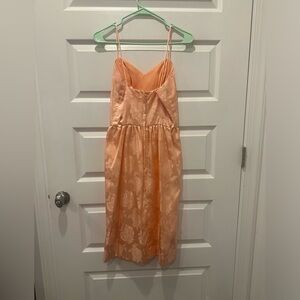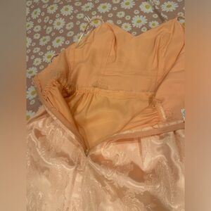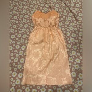 Elegant peach satin dress with floral pattern. Perfect for special occasions. Very fitted, pencil dress, structured v neck, spaghetti strap, no stretch, small bottom black slit. No brand, fabric or size label. 41 in long ( including straps ) 36 in long ( just body ) 16 in pit to pit, 15 in bust, 12 1/2 in waist, 18 in hips.