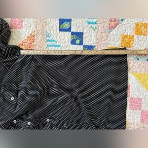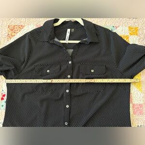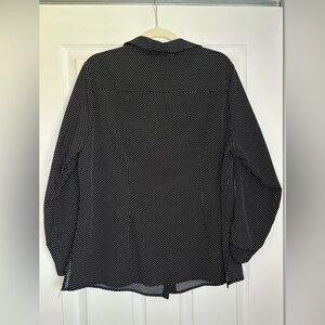 Stylish polka dot shirt with button front. Features long sleeves and chest pockets. Perfect for any occasion.