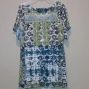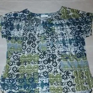 Size XL. Multicolored. Green, blue, brown, white. Pullover. Short sleeve. Lightweight material. Pit to pit 24". Length 28". Arm length from pit 2".