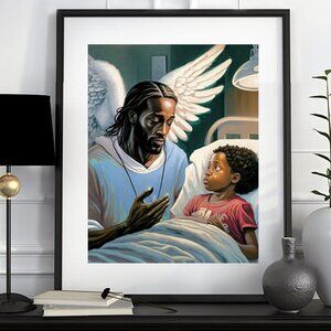 Black Angel with Child at Hospital Fantasy Art Oil Painting Print Fantasy Art Oil Painting Print
