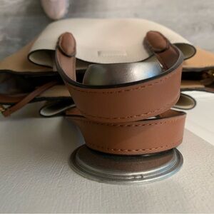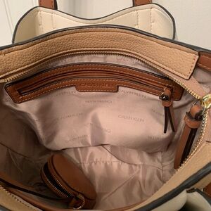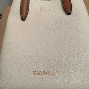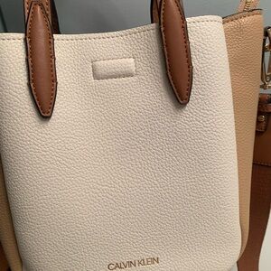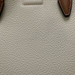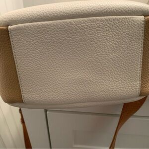 This is a handbag/tote or crossbody bag with removable guitar strap. Textured faux leather bag has multiple components and zippered main pocket. Large open section inside on the side of bag. 2 open sections on outside with magnetic closures. Coin pouch-detachable. Gold hardware. 12x10x4. On the front is a spot hardly noticeable. I took pics outside and inside to show the spot. Really not noticeable. Smoke free home.