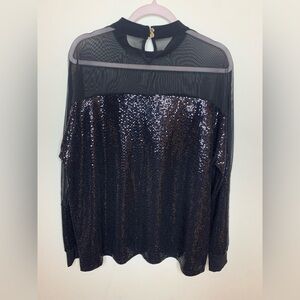 This elegant black blouse from Nine West showcases a dazzling sequin design and a refined mandarin collar. The backless feature adds a bold flair, making it ideal for sophisticated occasions. Its sleek silhouette and shimmering texture ensure a chic and polished appearance.
