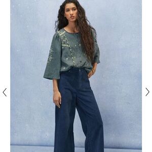 Soft green linen with a geometric embroidered design. Pearlescent button front closure. Bell sleeves. This piece is the perfect item to elevate your wardrobe and wear to most any occasion. Style and comfort effortlessly combined!
