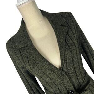Vintage Distinctive New York ribbed cardigan in women’s size Small. Longline silhouette with button front, notched collar, patch pockets, and removable waist tie belt. Earthy olive green knit with a structured yet cozy feel. Style open as a cardigan or belted as a sweater dress — perfect for dark academia layering or cottagecore-inspired outfits.