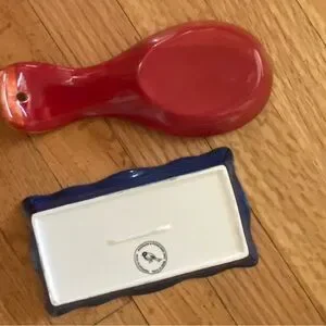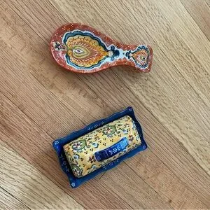 Vibrant ceramic set with intricate patterns. Includes a spoon rest and butter dish. Perfect for adding color to your kitchen.