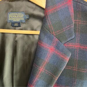 STUNNING Pendleton wool blazer jacket in red and blue plaid tartan. I can’t get over how perfect this is, barely worn (has spare buttons attached) perfect condition, two large front pockets, fully lined.