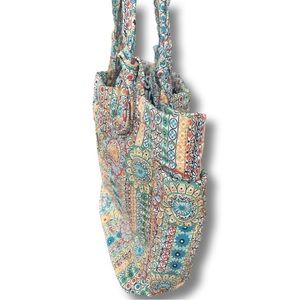 This tote was never used and is in excellent condition. Its interior has the signature lining and is very spacious, including two open top pockets on one side and an embossed zipper pocket on the other. There is also a pocket on either side of the exterior for holding water bottles and such. The bag opening can be fastened shut or left open, as there is a strong magnet in the lining. This quilted floral print is bright colorful, making it great for spring and summer. The name plate is stunning and without flaws such as scratches. I welcome offers!