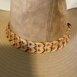 Stylish Camel Brown suede western hat featuring a colorful woven band. Perfect for any ranchman or just adding a touch of rustic charm to any outfit.