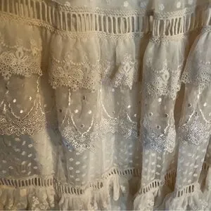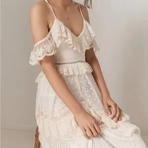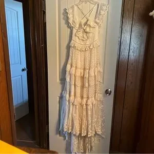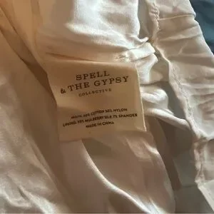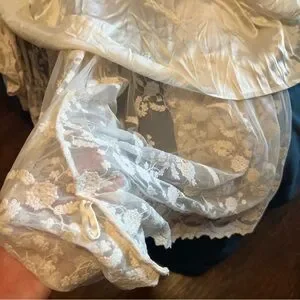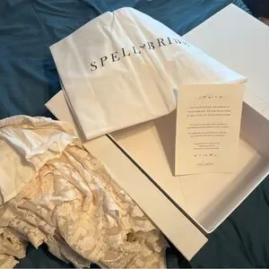 NWT Spell Chloe gown in Off-White. Size small. Stunning lace. Elasticized through the top/shoulder straps for a comfy fit. Lined. Side zipper. Has a loop at the end of the train to make carrying it easier. Fits tts. All of the spell campaign models are wearing it in size small. So so so romantic 🥹 Will include the original box, bridal garment bag, and note from spell. Please note the box is not in perfect shape, but I ran out of room for pics.