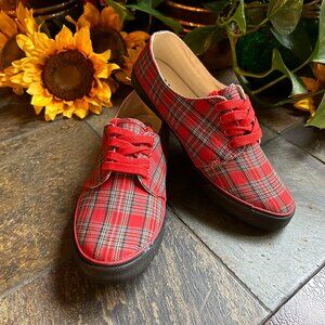 • Royal Stewart tartan plaid oxford-style sneakers with red laces