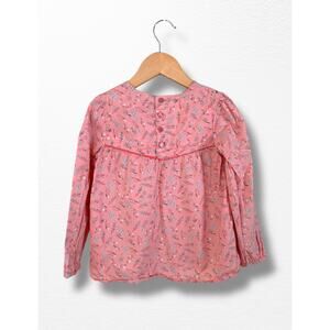 Light coral/pink lightweight smock blouse from Sergent Major in girls’ size 6. Lots of adorable details like pearlescent owl buttons on the back, buttoned cuffs, a dainty feather print, and an embroidered yoke with coral ric rac trim. 100% cotton, in very good pre-loved condition.