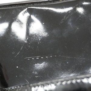 Elegant black patent leather. Iconic CC logo. Gold-tone hardware. Top handle and shoulder strap.
