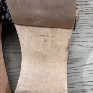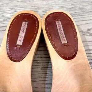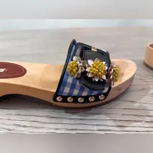 Fabrizio Viti Blue Gingham Wooden Sandal Size 7. Made Italian Made. Blue & White Gingham With Black Leather Buckle, Gold Hardware & Leather Flower Details. Slip-On Style With Wooden Footbed & Rubber Soles. ***minor scratches on wood. See photos for details and condition.