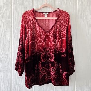 Sundance Boho Silk Sheer Red Flocked Velvet Burnout Ombre V Neck Longsleeve XL