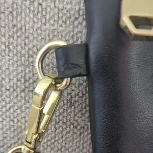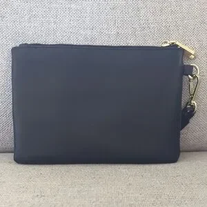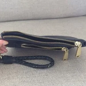 Chic black clutch with gold zipper detail. Features a braided wrist strap. Ideal for versatile styling.