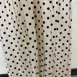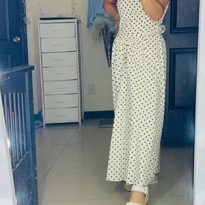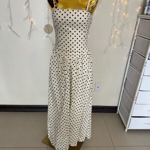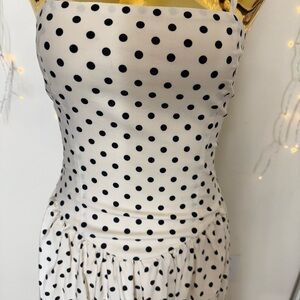 Chic and stylish, this polka dot spaghetti strap dress is perfect for any occasion. The classic black and white design offers a timeless look. Worn only once, lining under the dress, in very good condition.