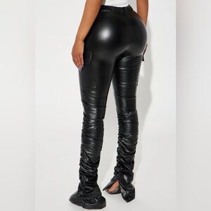 Elevate your style with these sleek black faux leather cargo pants. Perfect for a night out or a chic daytime look.