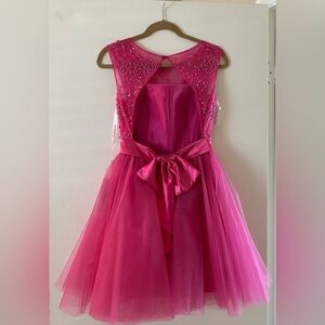 NWT Charming pink dress with tulle skirt. Ideal for formal events. Features a bow and lace details.