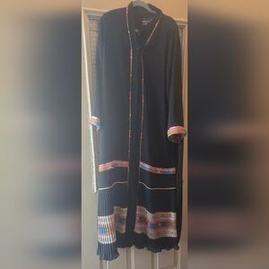 Step into effortless sophistication with this one-of-a-kind abaya that blends classic black with vibrant embroidered detailing. The colorful tribal-inspired trim along the sleeves, front, and hemline makes this piece stand out as a must-have for anyone who loves timeless fashion with a modern, trendy twist.