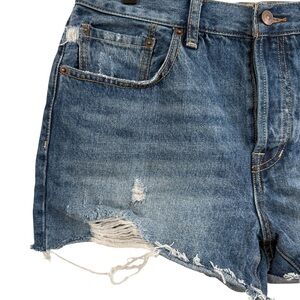 Trendy distressed jean shorts. Classic blue hue. Perfect for casual wear.