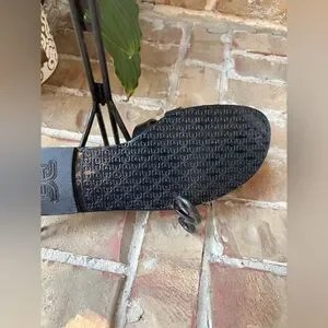Stylish black slide sandals. Features signature logo design. Comfortable and chic.