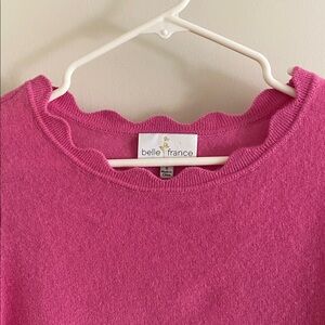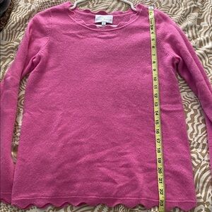 Beautiful 100% cashmere sweater with sweet scallop details around the neck, hem, and sleeves. Vibrant pink. Gently worn, no holes or stains.