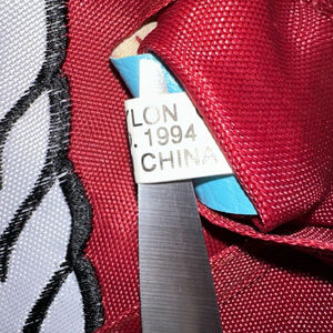 Pre-owned silk-like fabric magic prop depicting an angel and dove. The 22" x 16" piece shows minor wear and fraying along edges. Colors include red, blue, and white. Image is hand-painted. Made in China, 1994. The material feels thin and slightly worn, with some loose threads visible. No brand markings other than the 'Made in China 1994' tag. Functionality as a magic prop is assumed but not guaranteed.
