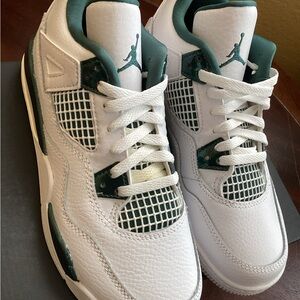Classic Jordan 4 sneakers for kids. White with dark green accents. Ideal for active play.