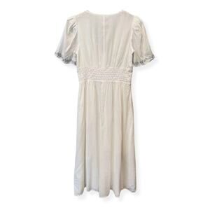 This beautiful Reformation dress is a versatile wardrobe addition, blending modern style with vintage-inspired embroidery. The smocked waist and detailed sleeves make it a standout piece for any occasion.