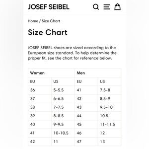 JOSEF SEIBEL shoes are sized according to the European size standard. To help determine the proper fit, see the chart for reference in the pictures.