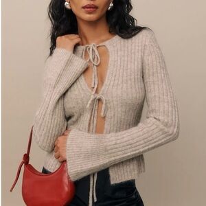 Reformation Rebecca Cashmere Alpaca Tie Front Cardigan Sweater Jumper Small in Barely Tan. Cute bow ties accent this minimalist and feminine cozy cardigan. Features a soft cashmere and alpaca blend, adjustable ties, and hook and eye front closure