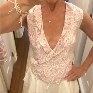 A delicate floral pink wrap top in a soft silk from Anthropologie. Inner tie at waist & outer tie for a custom fit. Perfect for any occasion, it offers a flattering fit and a pretty floral design. Freshly dry cleaned. Flawless.